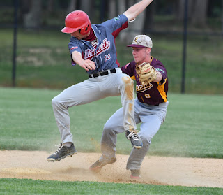 Collegiate baseball from the Hamptons Colligate summer leauge as the runner tries to dodge the second baseman's tag
